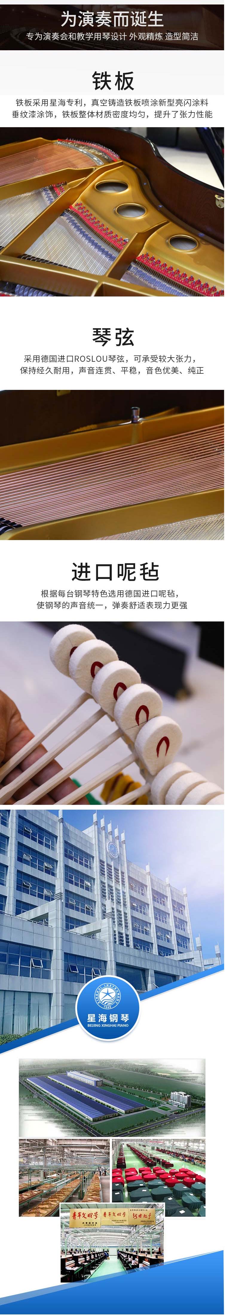 鐵 板:鋼板采用真空鑄造技術(shù),抗張力性能提高,其棱角清晰,表面細(xì)膩,噴涂了星海新型亮閃涂料,凸顯了金屬質(zhì)感,根據(jù)鋼琴發(fā)聲原理進(jìn)行的結(jié)構(gòu)設(shè)計(jì),提高了三個(gè)音區(qū)的協(xié)振性能。